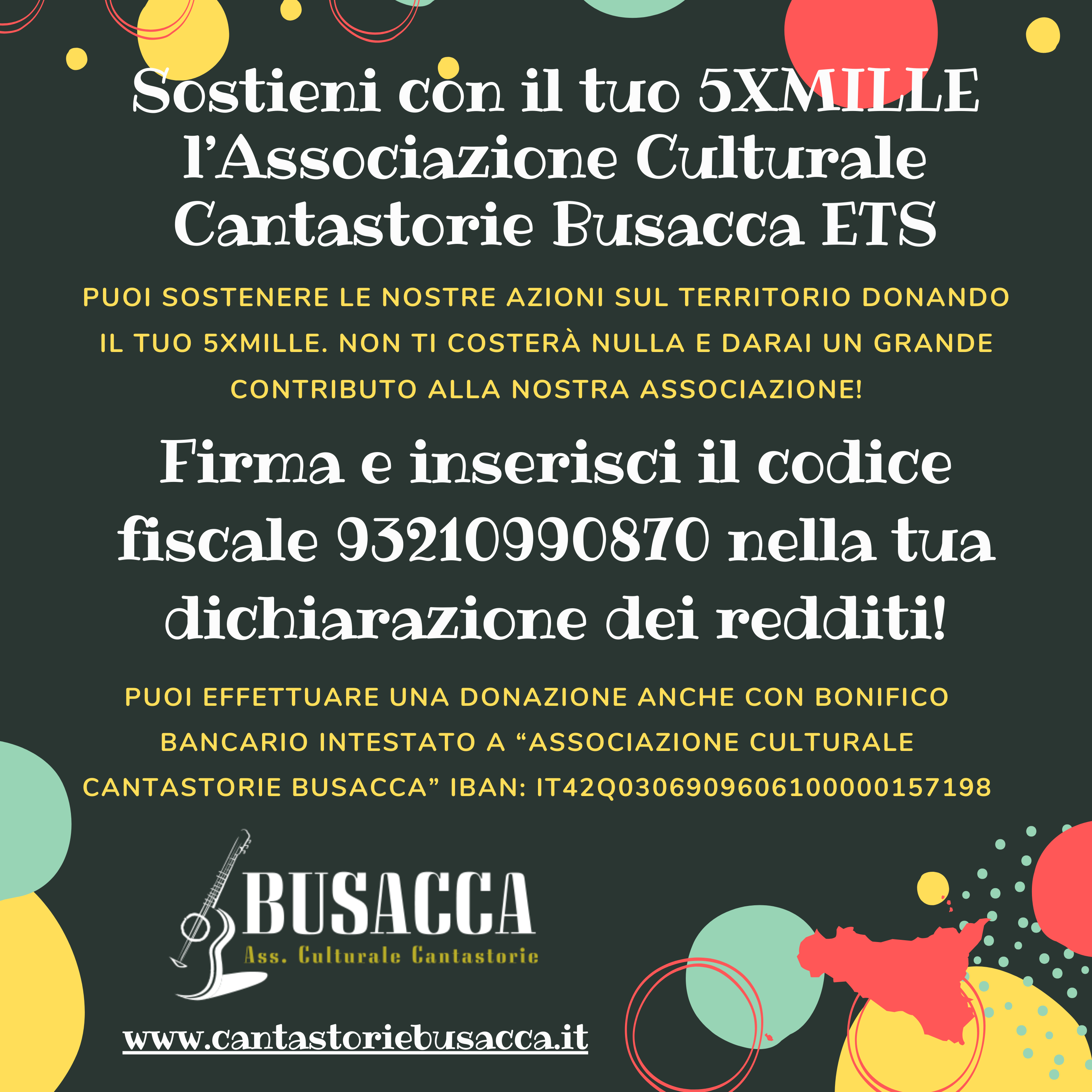 Destinare il 5x1000 all’Associazione Culturale Cantastorie Busacca ETS è un gesto di grande valore per le nostre attività sul territorio.